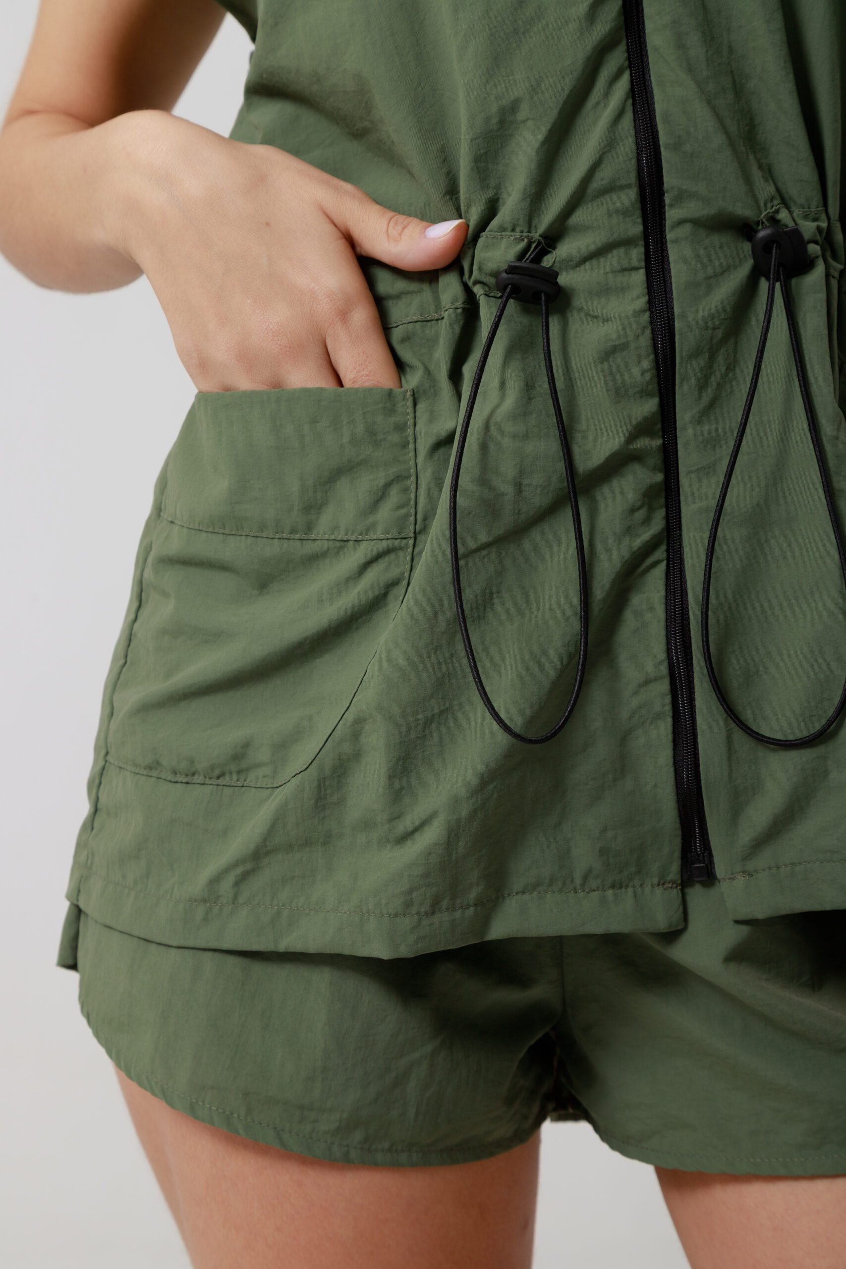 Fabricada em tactel de poliamida, possui elástico para regulagem. Possui capuz.