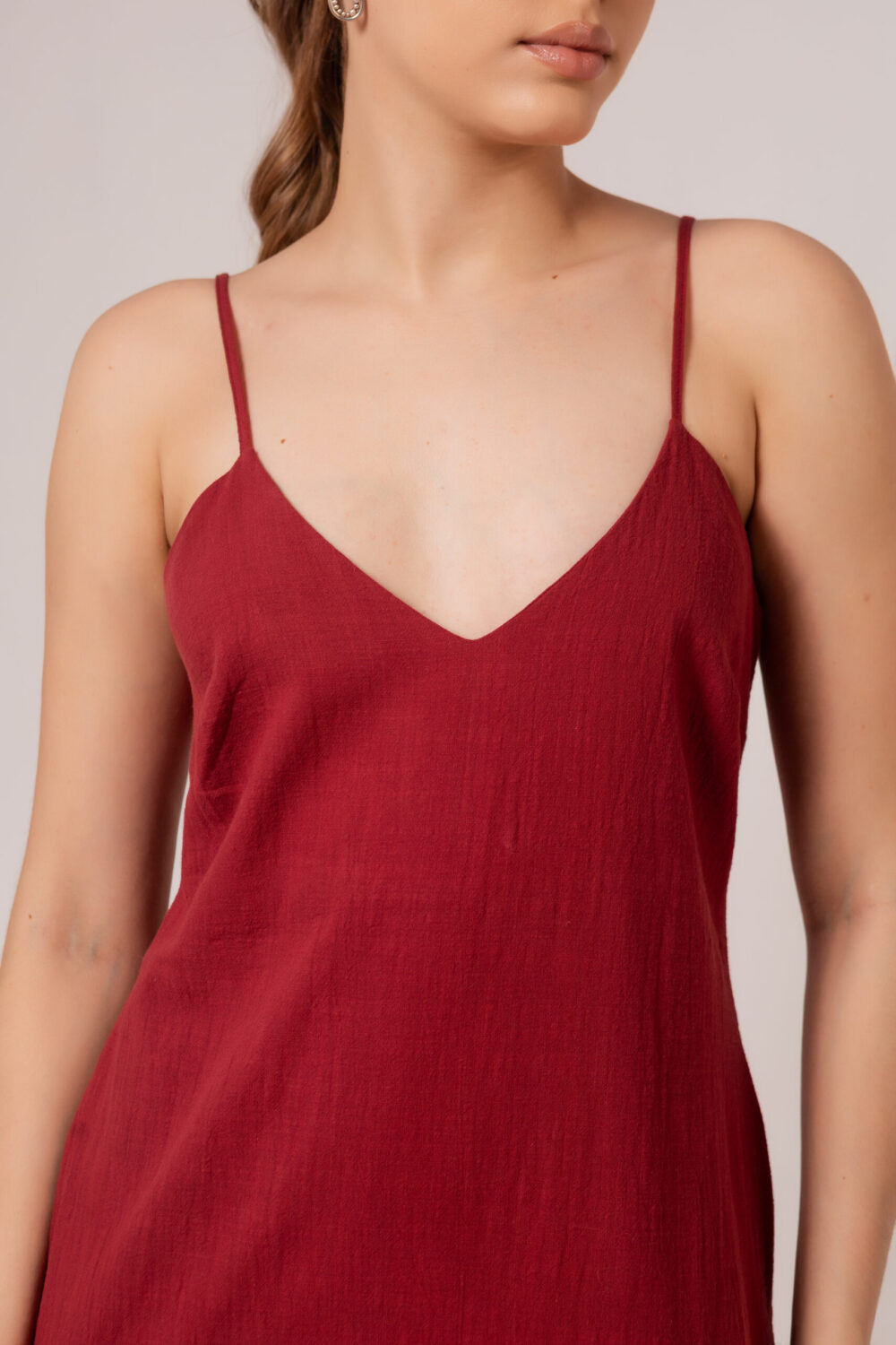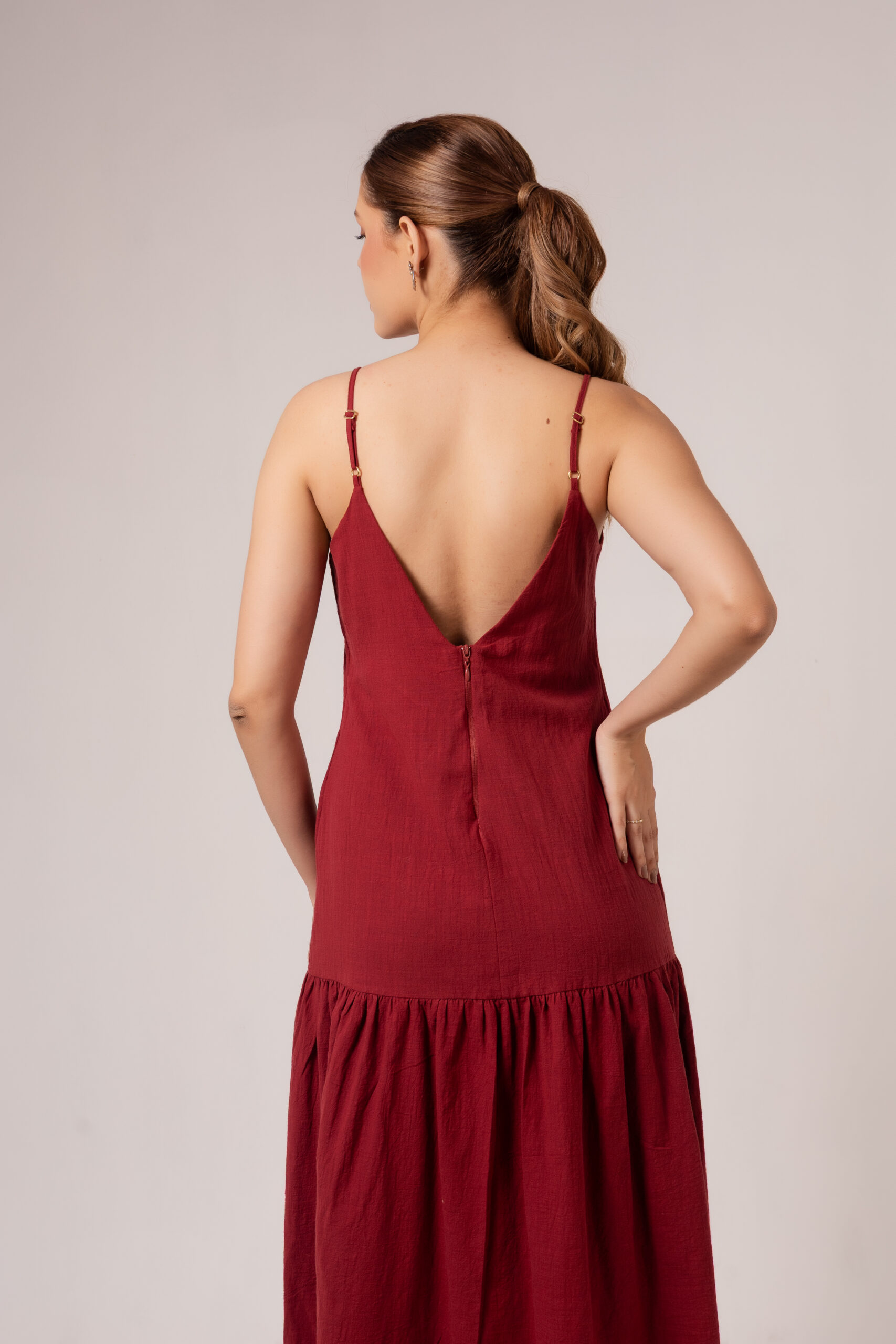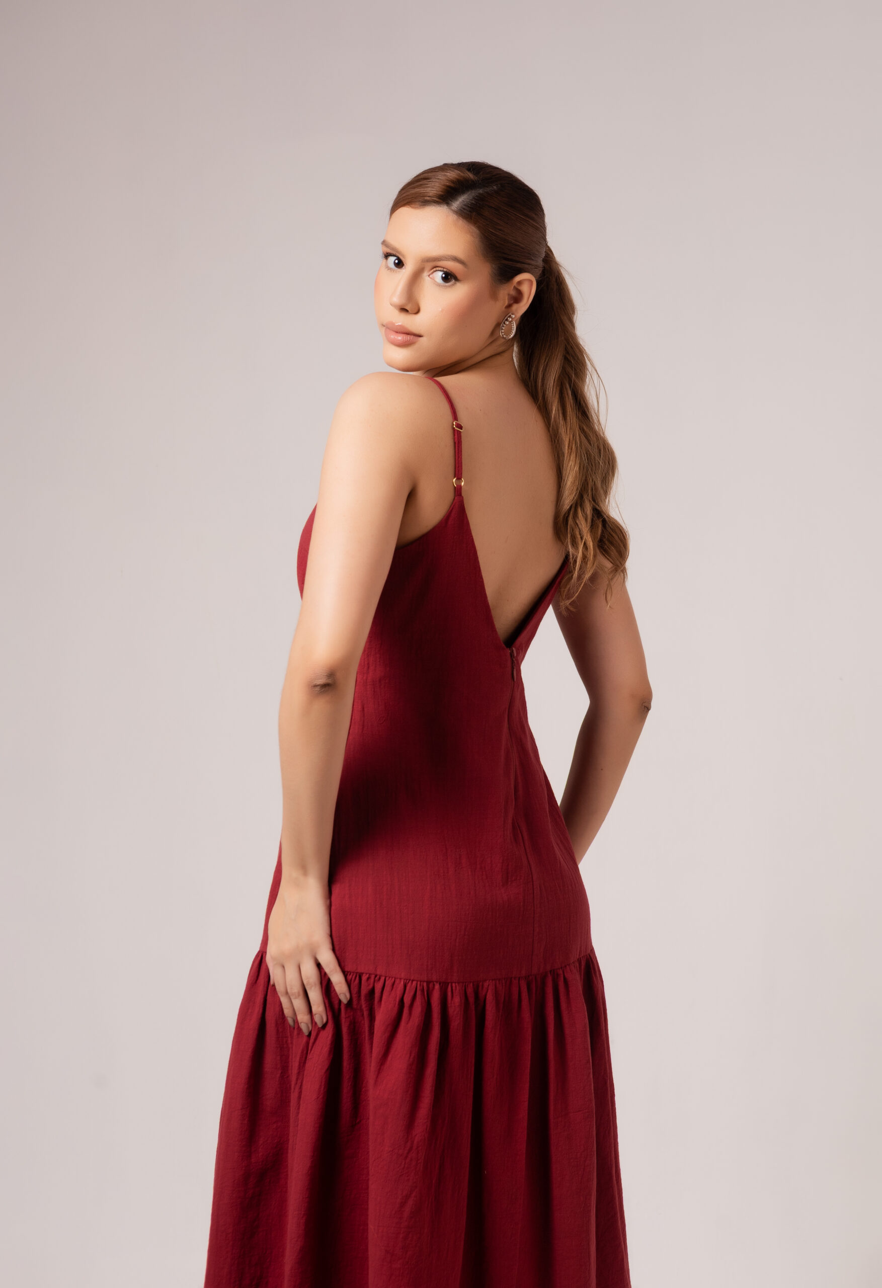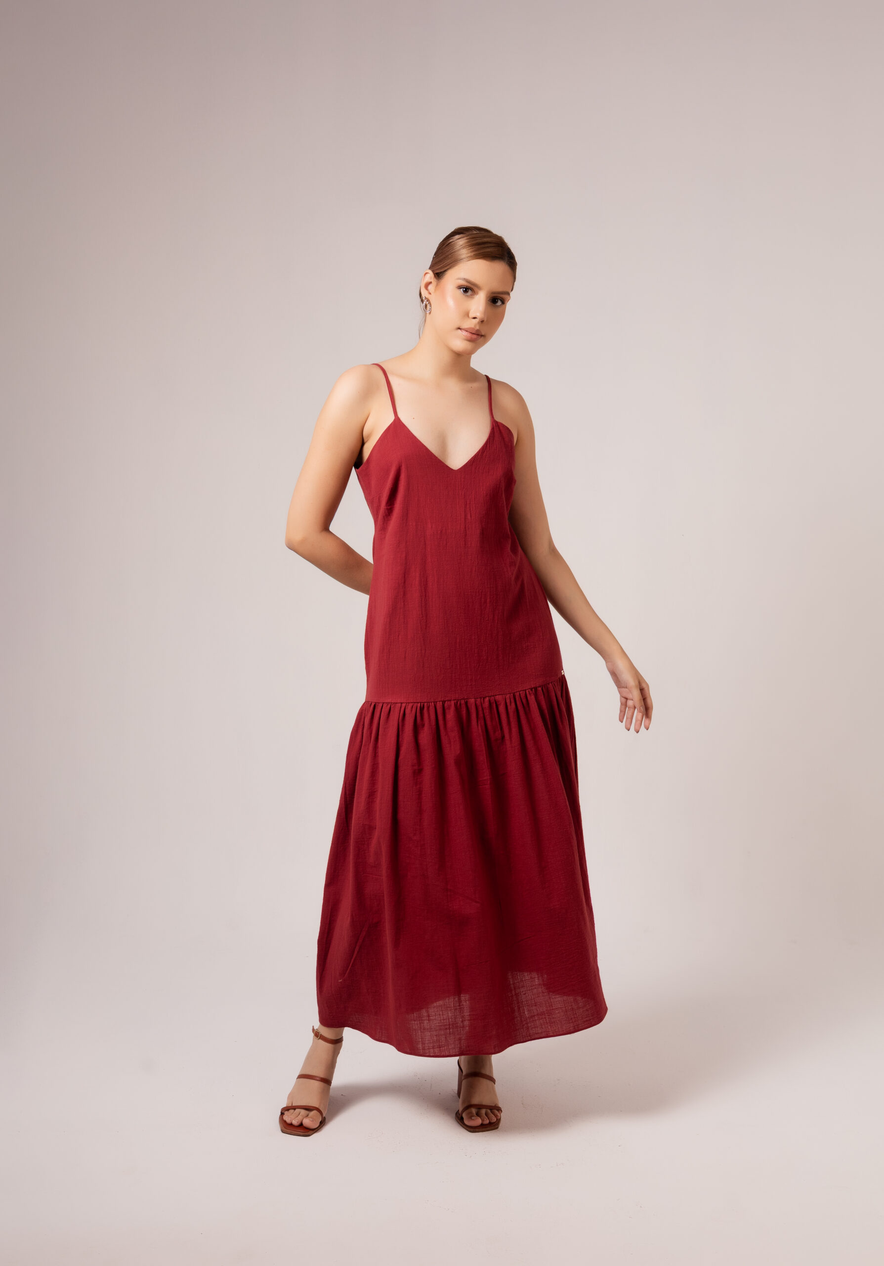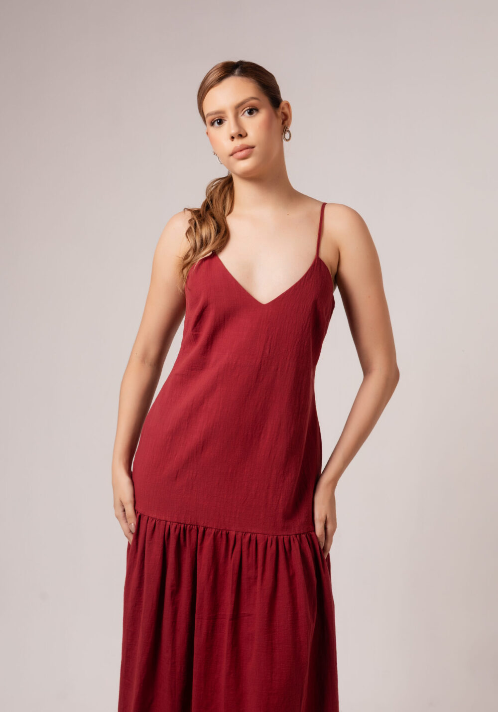Vestido em tecido de algodão com textura. Possui alças reguláveis e comprimento longuete.